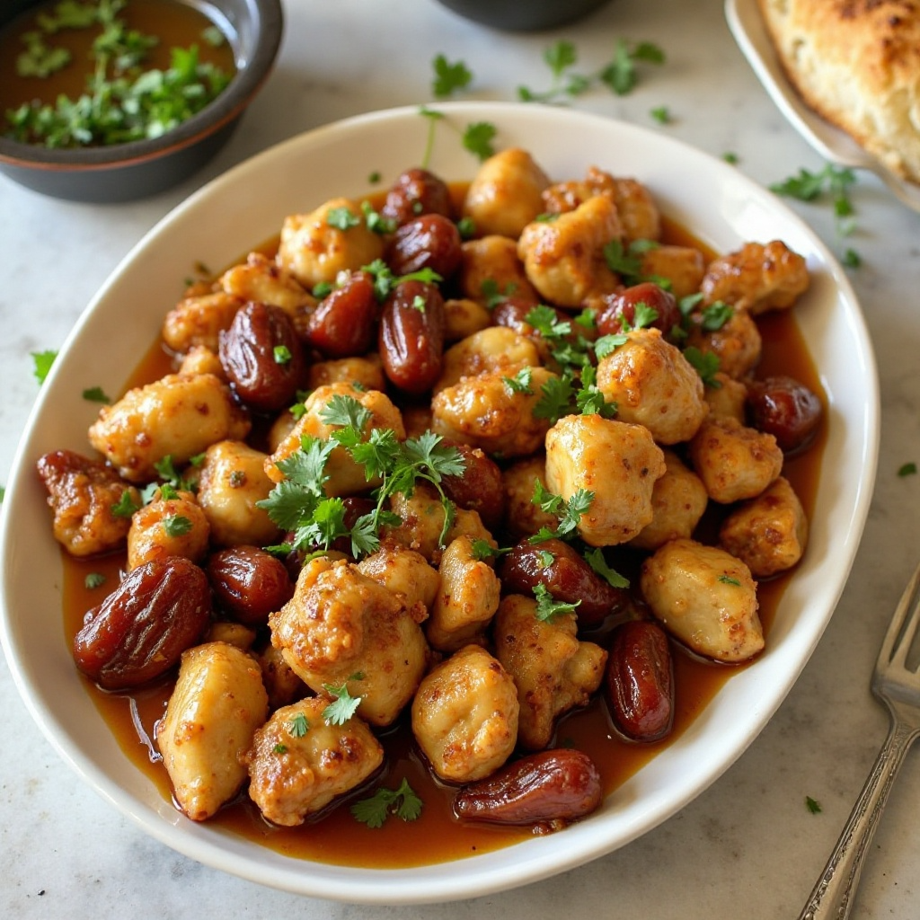 Este plato ofrece proteínas magras del pollo y un toque saludable de dátiles secos, rico en antioxidantes. La salsa, elaborada con ingredientes naturales, es una opción ligera para quienes buscan disfrutar de sabores intensos sin exceso de grasas. Puedes ajustar la cantidad de miel de dátil según tu preferencia de dulzura.