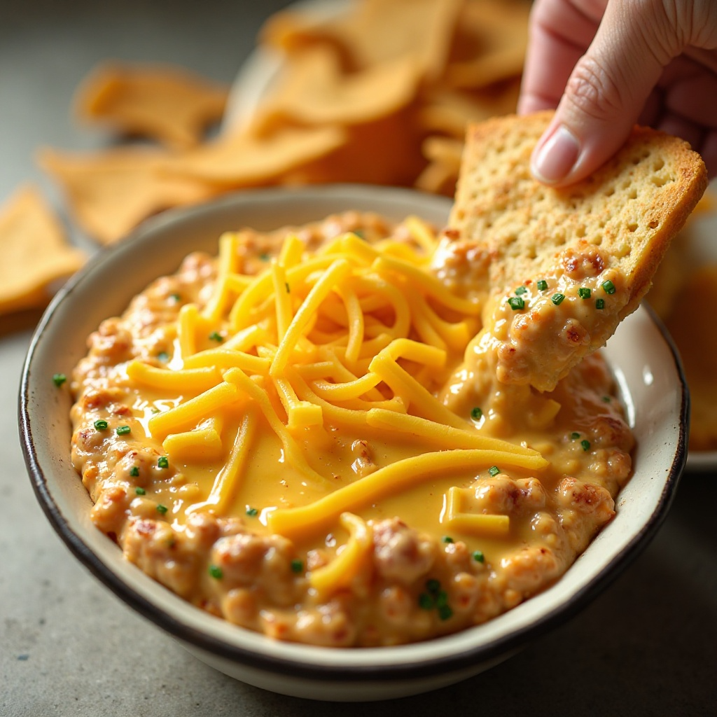 - Sirve la mezcla de queso caliente en una bandeja o plato para una presentación atractiva. Cubre con queso rallado cheddar y sirve con chips de maíz o tostadas para disfrutar como aperitivo o plato principal.
