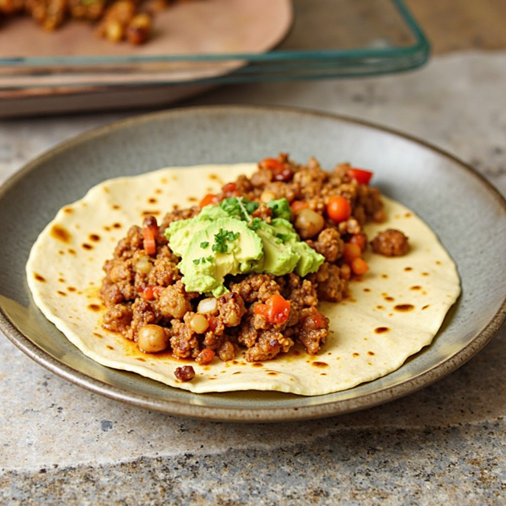 - En una plancha o sartén antiadherente, coloca la tortilla de maíz. Espolvorea sobre ella los ingredientes de carne y verduras, dejando un borde sin cubrir para enrollar la tortilla.