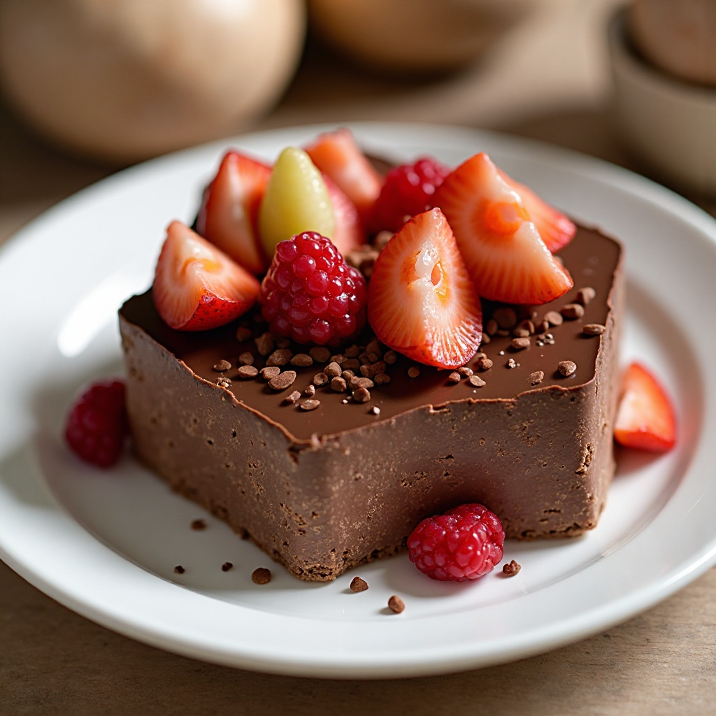 - Una vez frío, corta el chocolate en porciones y sirve con frutas frescas y mermelada. Asegúrate de que las frutas estén bien limpias y cortadas en cubos uniformes para un toque estético.