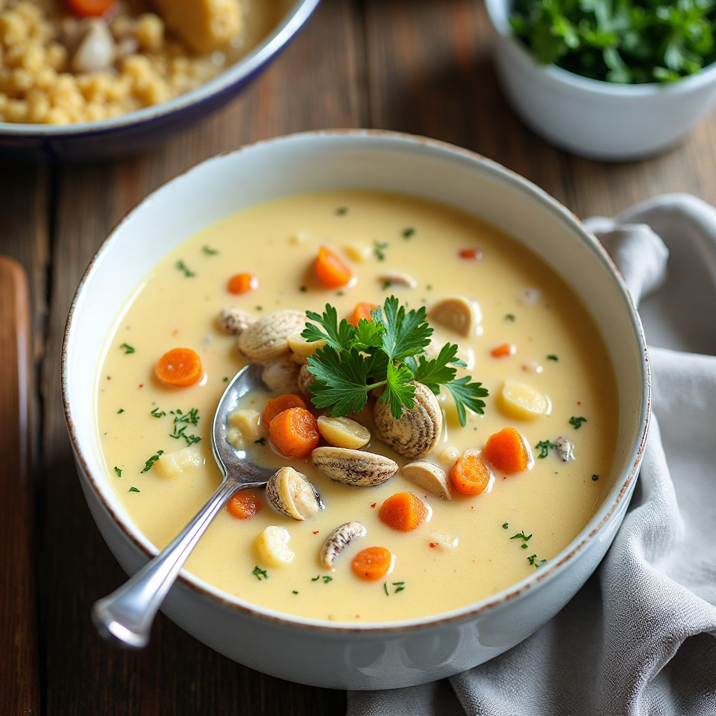 Este chowder es una fuente de proteínas de mar y contiene vitaminas del complejo B gracias a la cebolla y las verduras. Sin embargo, debido a su contenido de crema de leche, se recomienda moderación para quienes siguen dietas bajas en grasa. La sal gruesa del Atlántico agrega un sabor auténtico, pero puedes ajustar según tus preferencias.