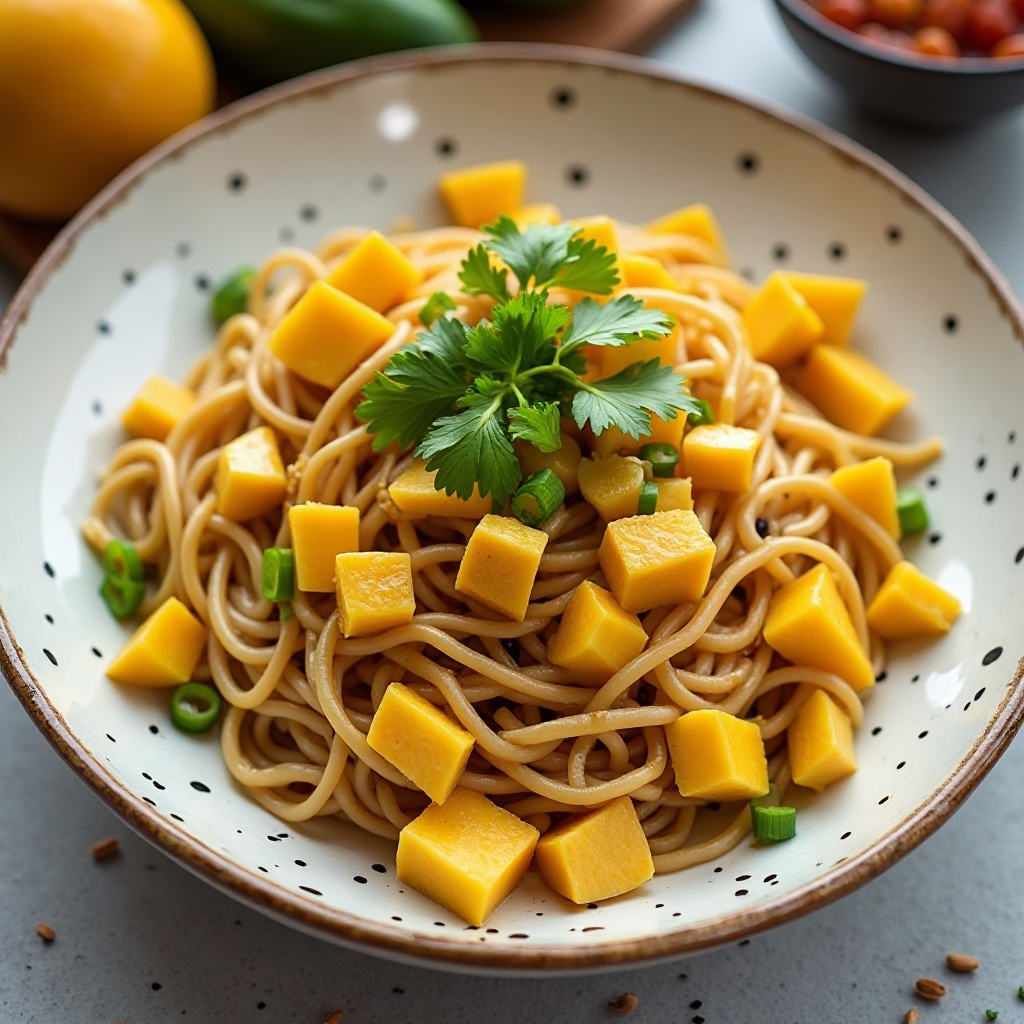 - Agrega los fideos cocidos al plato, asegurándote de que estén bien cubiertos con la salsa y el mango.
