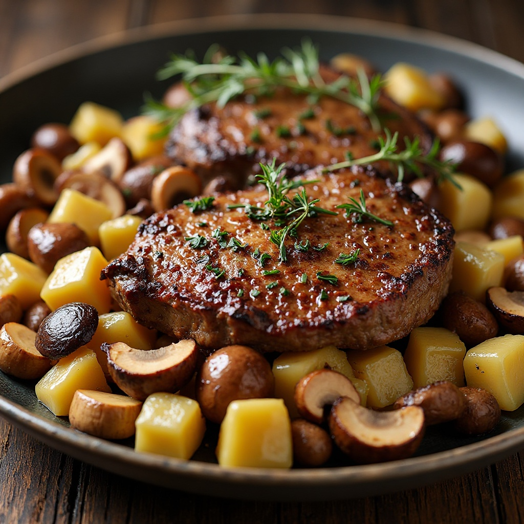- Sirve las papas y champiñones junto con la chuleta de ternera, asegurándote de que la chuleta esté bien caliente antes de servirla.