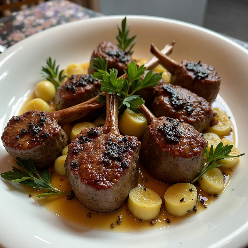 - Una vez listos los chuletillas, retíralos del horno, coloca una porción en cada plato, añade un poco de salsa de trufa y sirve inmediatamente, asegurándote de incluir un poco de la mezcla de cebolla, ajo y alcachofa con cada porción.