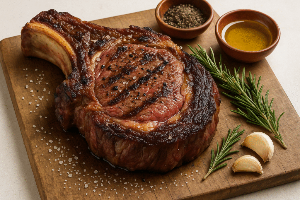 3. Coloca el chuletón en la parrilla sin añadir aceite ni sal. Déjalo sellar durante 3-4 minutos por cada lado, hasta que se forme una costra dorada.