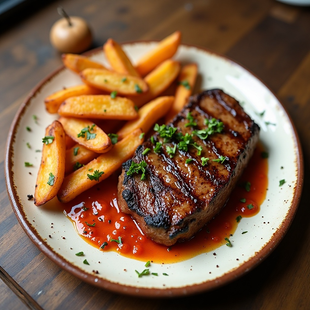 El chuletón de vaca vieja es una fuente de proteínas magras y hierro. Las patatas bravas, aunque ricas en sabor, deben consumirse con moderación debido a su contenido calórico. La salsa brava añade un toque picante que puede ser saludable en moderación. Si prefieres una versión sin gluten, asegúrate de que la salsa brava y cualquier condimento adicional sean sin gluten.