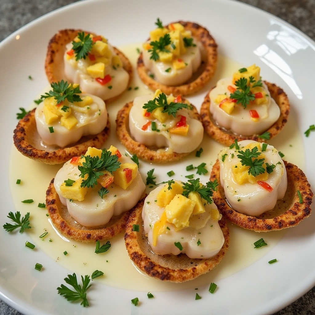 - Una vez que el relleno esté listo, vierte una capa sobre cada concha de vieira y coloca los cubos de huevo duro encima para decorar.