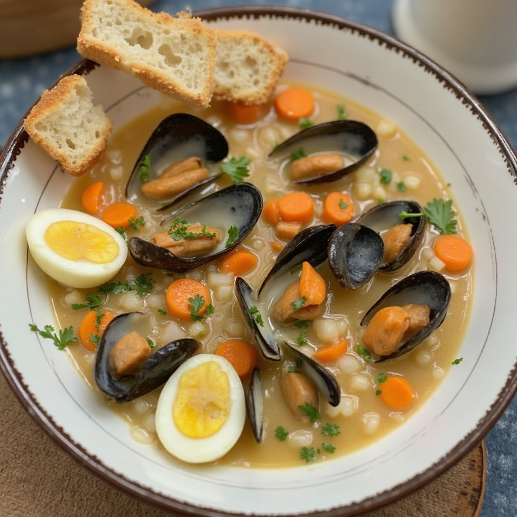6. Si deseas textura adicional, fríe las latas de mejillones separadamente con los huevos batidos hasta que estén doradas. Añade estas en trozos a la sopa justo antes de servir.