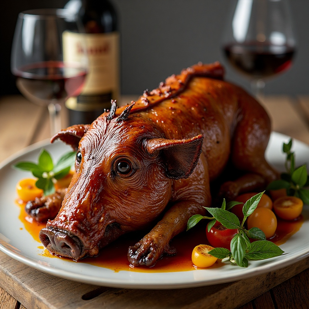 Este plato, al ser un cochinillo asado tradicional, es rico en proteínas y grasas saludables. El uso del vino Ribera del Duero no solo aporta sabor, sino que también contiene compuestos antioxidantes beneficiosos. Sin embargo, debido a su contenido de grasa y alcohol, es recomendable consumirlo con moderación y disfrutar de platos menos grasosos o equilibrados para un balance nutricional adecuado.
