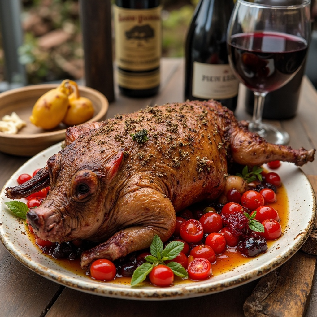 - Corta el cochinillo en rodajas gruesas. Sazona con sal, pimienta y comino. Vierte la mezcla de verduras y vino en una bandeja para horno, coloca las rodajas de cochinillo sobre la mezcla y hornea a 180°C durante aproximadamente 45-60 minutos o hasta que el cochinillo esté dorado y jugoso.