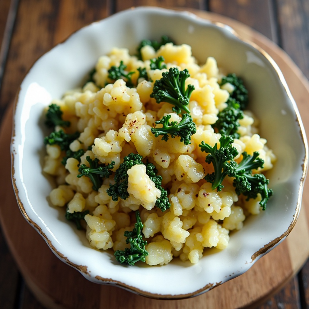 - Combina las patatas cocidas con su agua de cocción, la coliflor-kale, y saltea hasta integrar los sabores. Agrega mantequilla al final para darle cremosidad al colcannon.