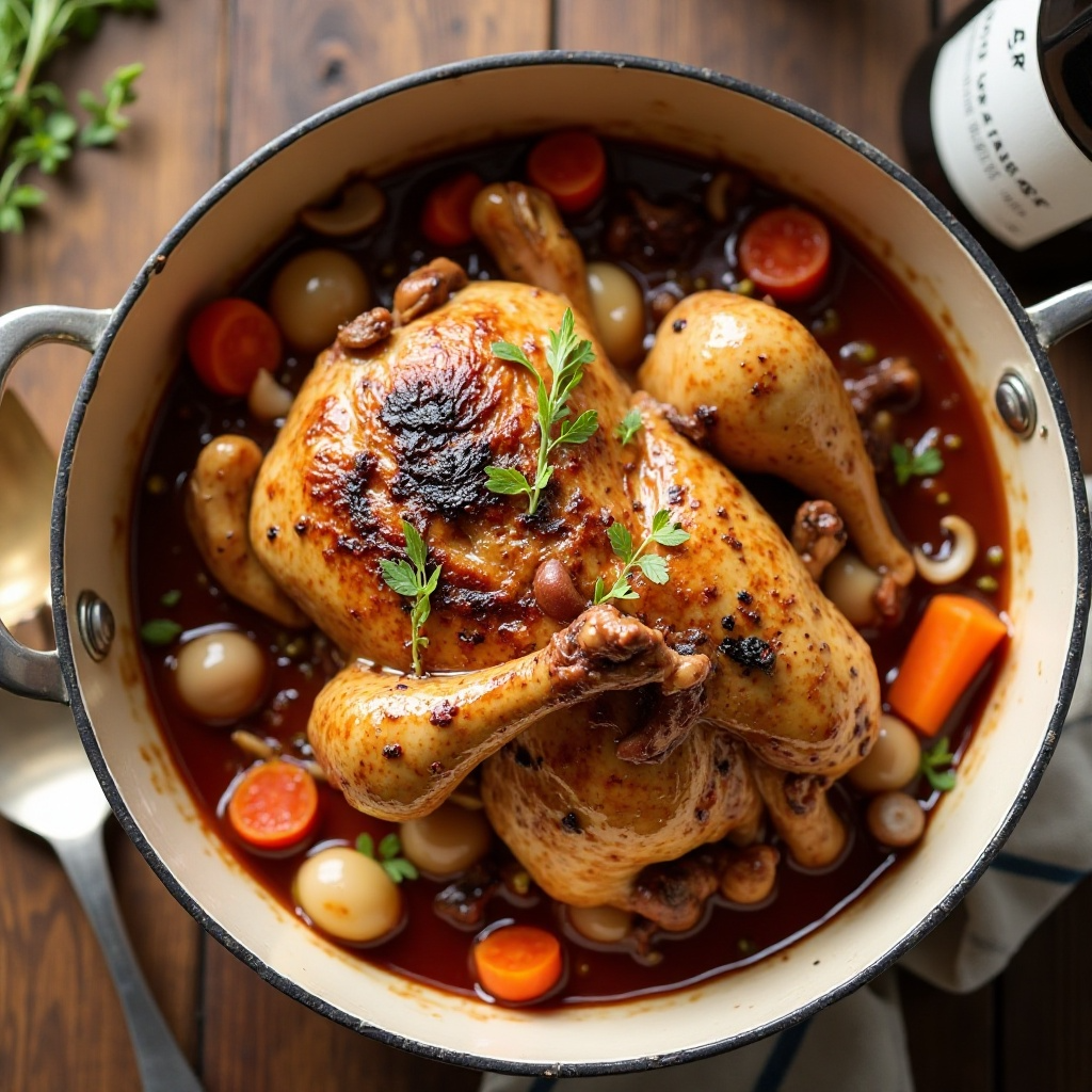 6. Cubre la sartén con la tapa y baja el fuego a lento. Deja cocinar a fuego lento durante al menos 1 hora, o hasta que el pollo esté cocido y el coq au vin esté rico y espeso.