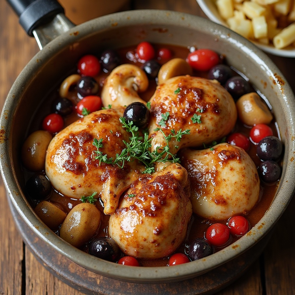El coq au vin es un plato tradicional francés que consiste en un pollo cocinado lentamente con vino, cebolla, champiñones, aceitunas y a veces bayas de arándano. Esta versión utiliza vinos tintos típicos de la región Auvernia-Ródano-Alpes, conocida por sus vinos robustos y llenos de sabor. Ideal para una comida especial o una cena romántica en casa.