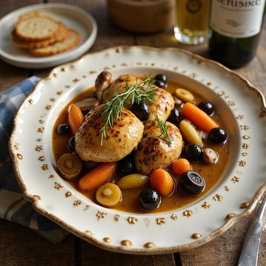 3. Vuelve a añadir el pollo y mezcla con la cebolla y champiñones. Agrega el vino blanco de Charente-Maritime, los arándanos (si los usas), las aceitunas, las rodajas de zanahoria y el bouquet garni. Cubre con un poco de caldo de pollo si lo deseas.
