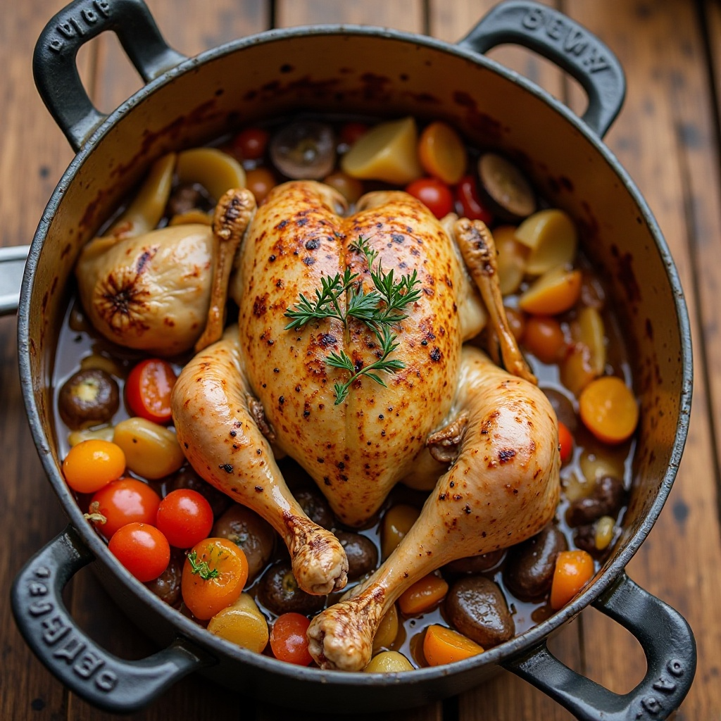El Coq au Vin es un clásico francés que se ha adaptado maravillosamente a través de las fronteras, incluyendo la región de Arnedo en La Rioja, España. Aquí se le da un toque distintivo con vino de Rioja, resaltando los sabores intensos y robustos de la tierra.