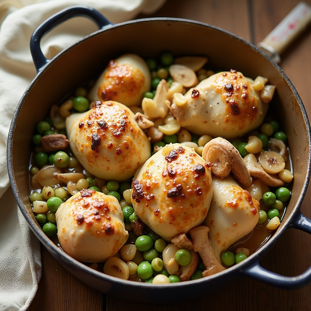 Esta receta es emblemática de la cocina francesa, especialmente apreciada en París, donde los restaurantes ofrecen platos tradicionales con un toque personal. El Coq au Vin ha trascendido generaciones y sigue siendo un plato favorito en celebraciones familiares y cenas románticas. Incorporar el champán francés le da un toque distintivo que simboliza la elegancia y sofisticación de París, haciendo que esta versión sea perfecta para un restaurante parisino o para una cena íntima.