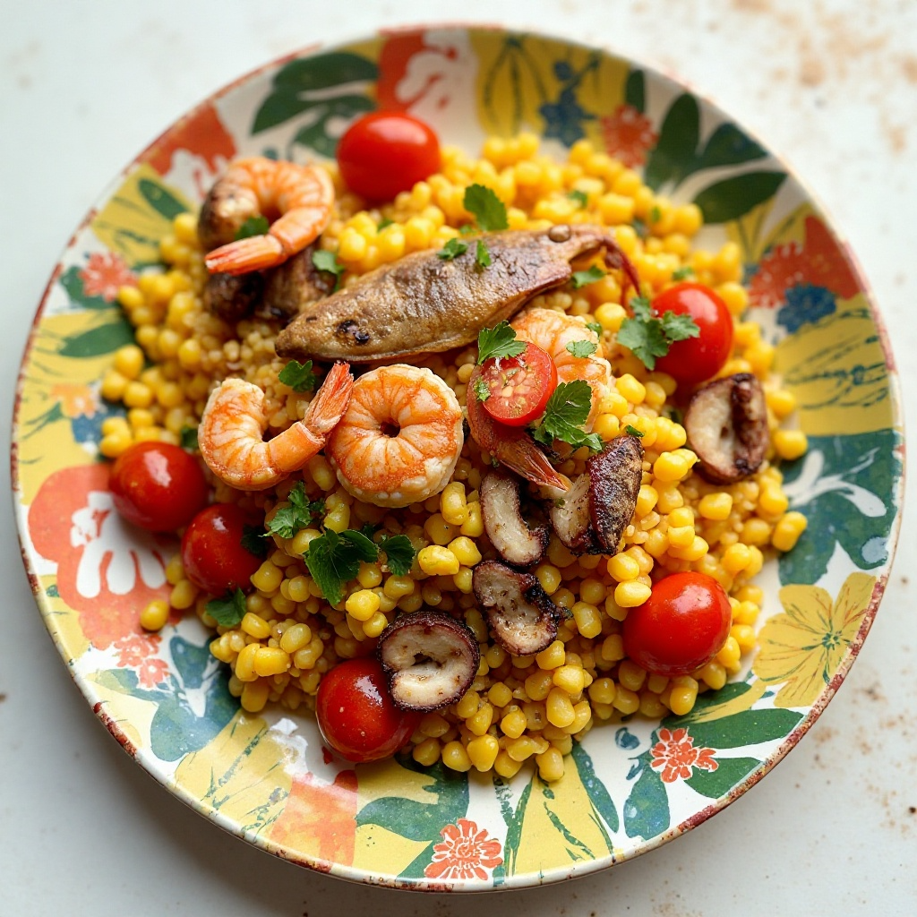 - Para servir, vierte el cou-cou en una fuente grande. Espolvorea el marisco con la mezcla de verduras, asegurándote de que cada porción tenga un equilibrio de sabores.