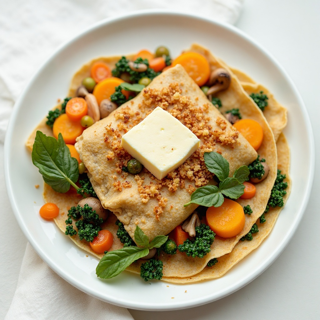 7. Sirve los Crêpes de Verdura en platos individuales, decorados con queso fresco desmenuzado si se desea. Sirva caliente o frío, según preferencia.