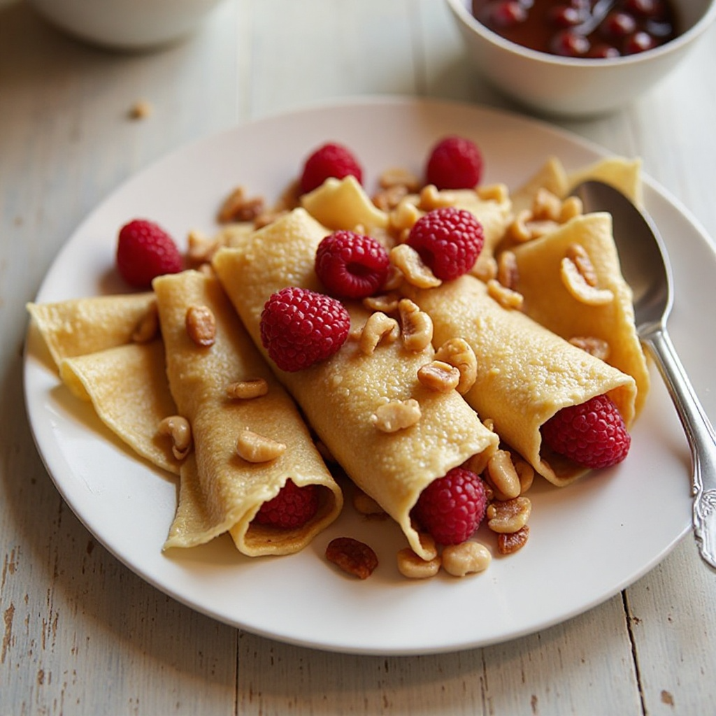 - Coloca una frambuesa en el centro de cada crepe y coloca un par de pralines encima. Enrolla el crepe cuidadosamente para cubrir el relleno y sirve inmediatamente.