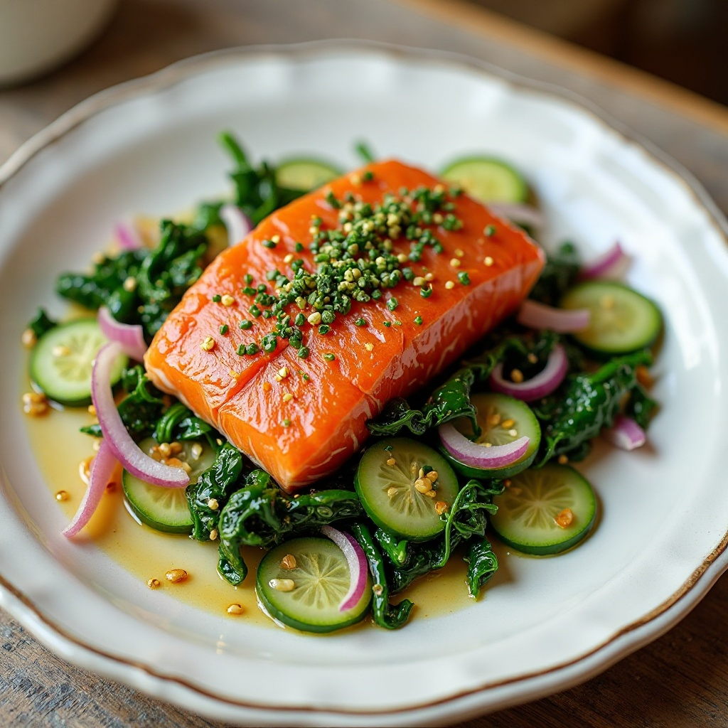 6. Coloca el salmon en el plato con las verduras, y adereza con el jugo de limón de la marinada. Sirve inmediatamente, disfrutando del contraste entre el salmón ahumado y las verduras frescas.