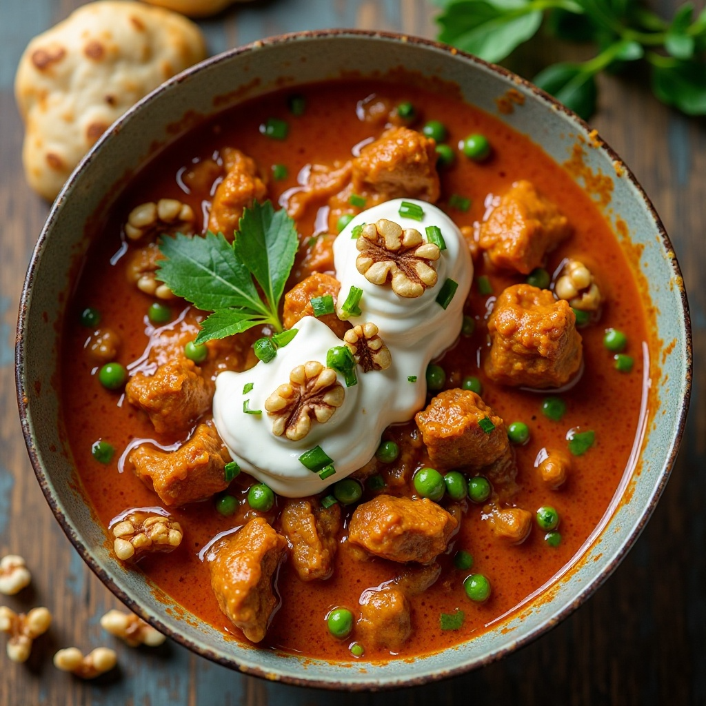 - Sirve el curry caliente con arroz basmati o pan naan, y espolvorea con nueces tostadas picadas como acompañamiento.