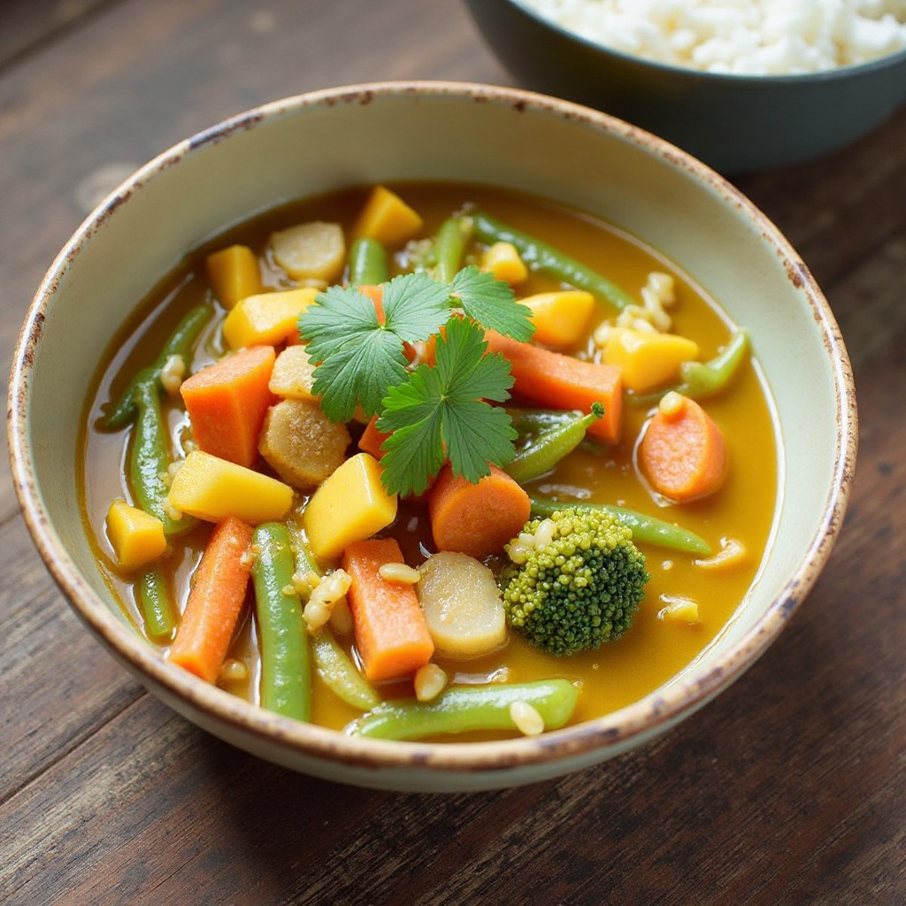 Esta versión vegetariana del curry massaman es una opción saludable, rica en antioxidantes y fibra gracias a los vegetales utilizados. Los especiosos pero suaves sabores de este plato son perfectos para quienes buscan variedad en sus dietas saludables. La salsa de pescado light se añade para realzar el sabor sin excesos de sal o grasas.