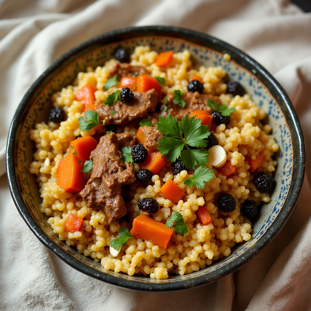 La cocina marroquí es conocida por su rica variedad de especias y sabores complejos. El cuscús marroquí con carne guisada refleja las influencias del norte de África, donde se utilizan hierbas y especias locales para crear platos que son tanto sabrosos como nutritivos. Este plato es un ejemplo típico de la cocina casera y festiva en Marruecos, a menudo servido durante las celebraciones familiares.