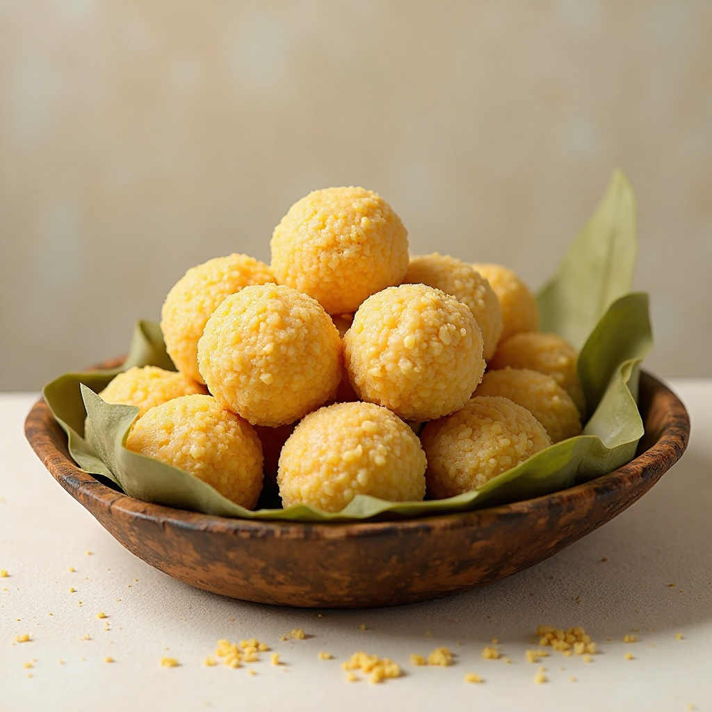 - Toma porciones de la masa de maíz y papelón y forma bolitas o cilindros pequeños. Si estás usando las hojas de plátano, envuelve cada bolita o cilindro en una hoja, atándola con hilo de cocina.