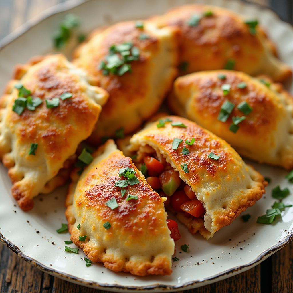 - Coloca las empanadas en una bandeja forrada con papel pergamino. Pincela con huevo batido y hornea a 180°C (350°F) durante 20-25 minutos, o hasta que estén doradas.