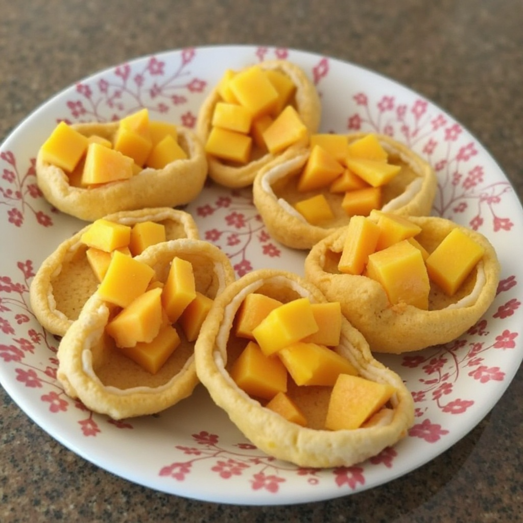 - Coloca una rodaja de frutas tropicales en cada masa de empanada y cubre con una capa del jugo preparado.