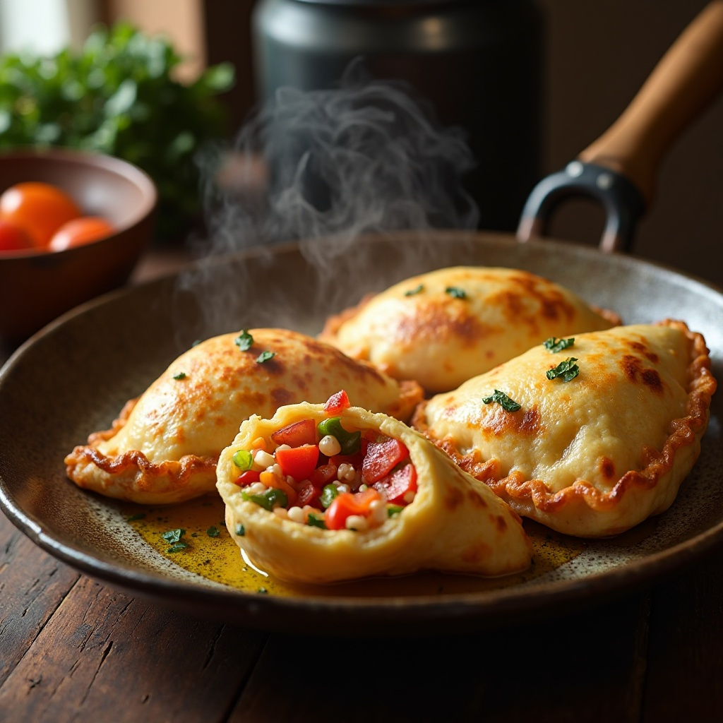 6. Cocina las empanadas en una sartén antiadherente caliente con aceite a fuego medio-bajo, volteándolas ocasionalmente hasta que estén doradas y crujientes por fuera (alrededor de 5-7 minutos por cada lado).