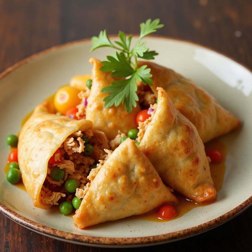 Este plato es una fuente de proteínas magras y vitaminas provenientes del pollo y vegetales. La cúrcuma, opcionalmente utilizada para un toque temático, tiene beneficios antiinflamatorios. Si prefieres una versión más ligera, puedes reducir el aceite de la fritura o cocinar las empanadas al horno.