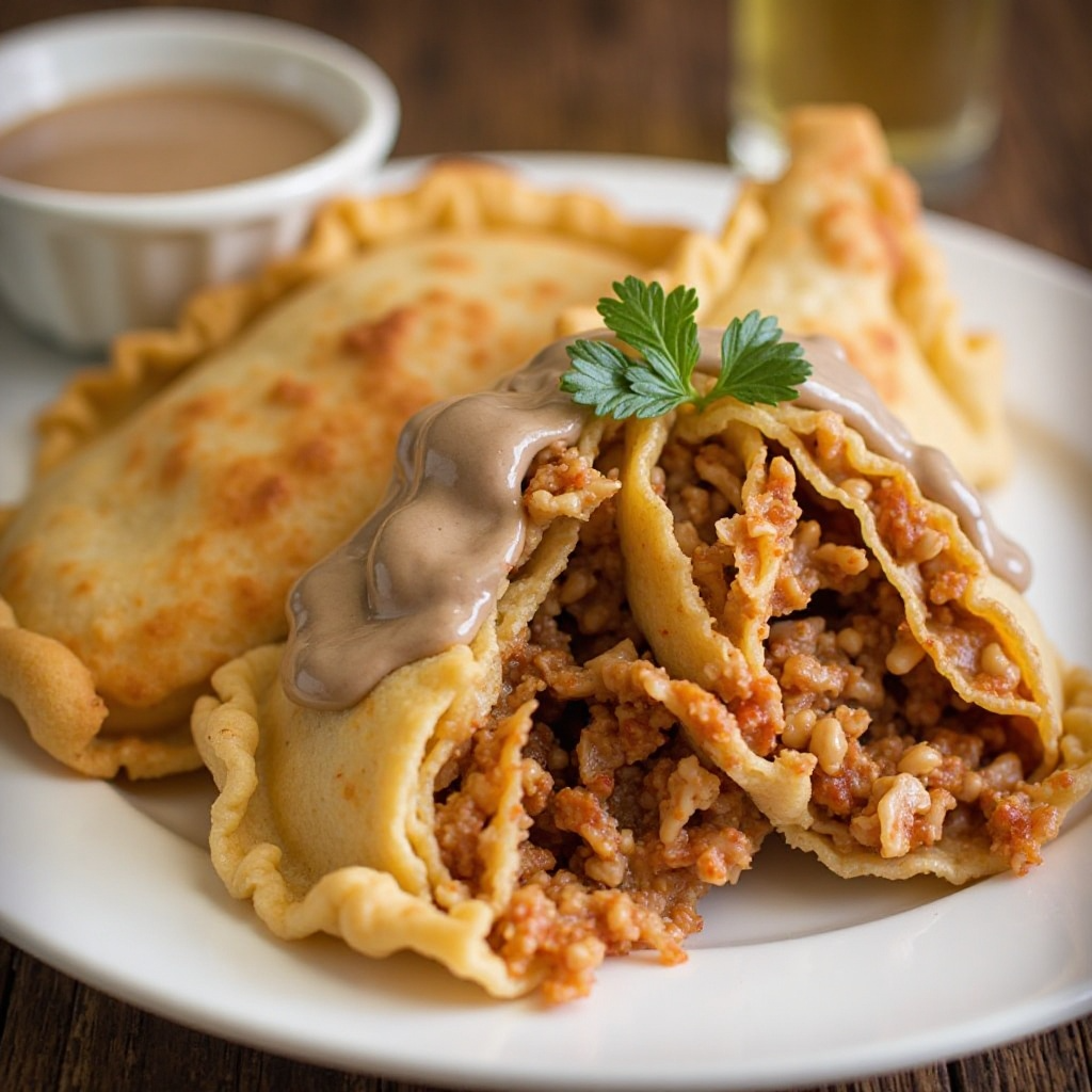 - Frie las empanadas en aceite caliente hasta que estén doradas y crujientes. Sirve caliente, acompañadas de la salsa cremosa de champiñones para untar.