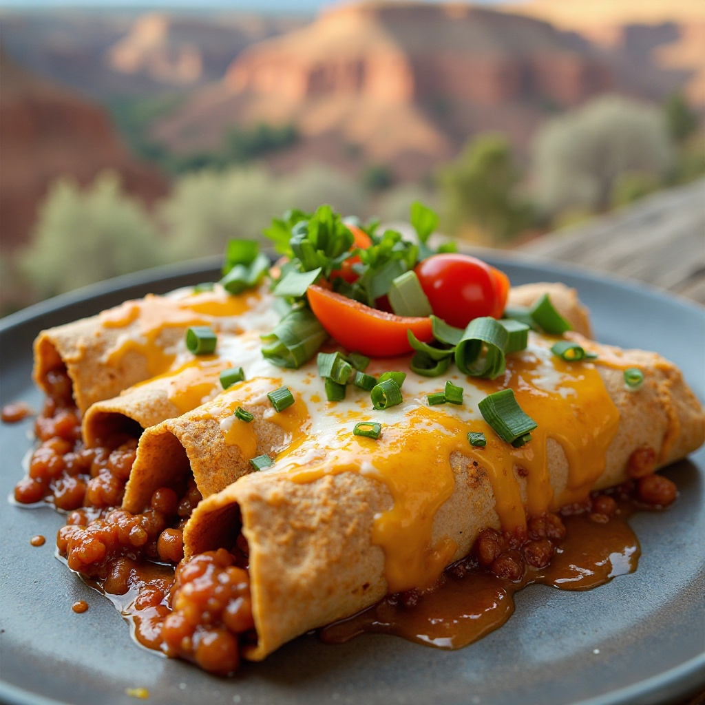El uso de maíz azul en las enchiladas no solo es una opción estética para platos como este, sino que también celebra la diversidad y riqueza cultural del México profundo. La región de Copper Canyon es conocida por su conexión con la naturaleza y la tradición ancestral, donde cada comida se disfruta como un momento de comunión con el entorno.