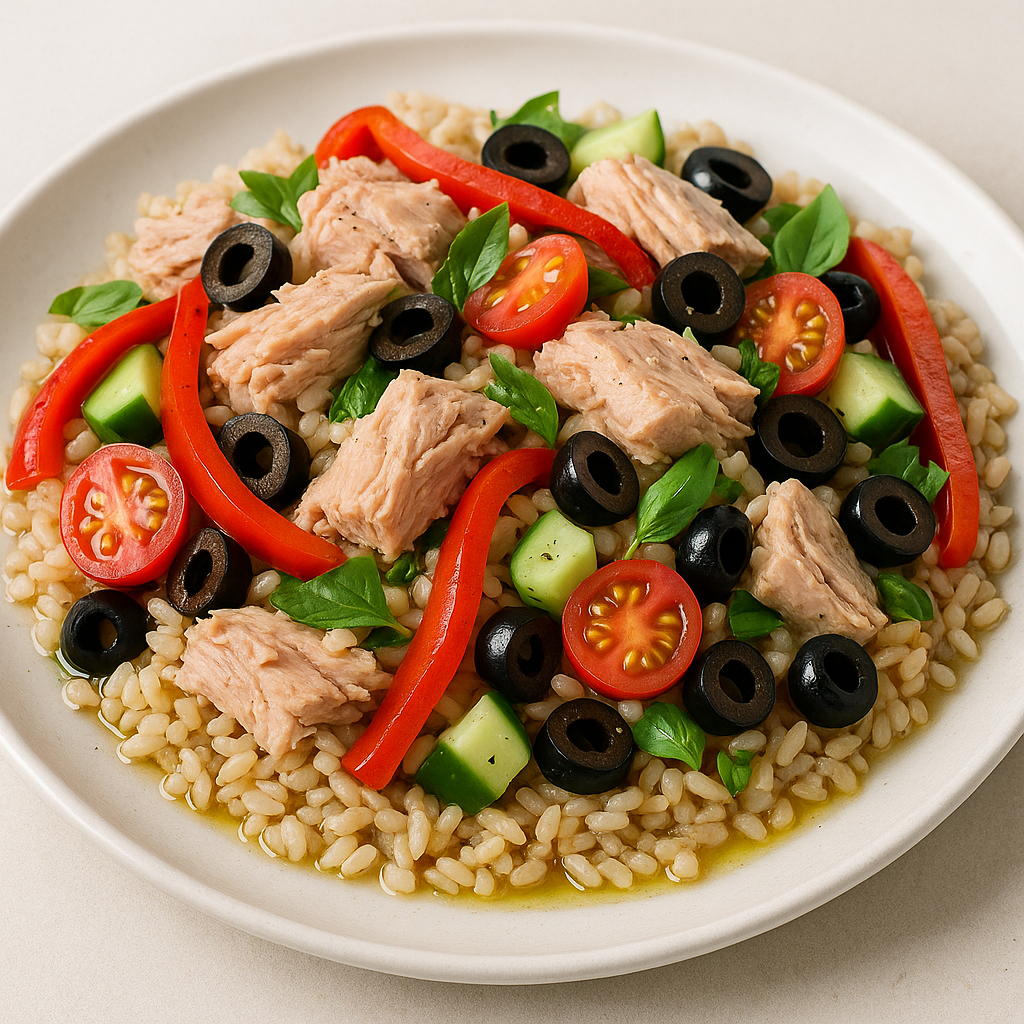 Este plato es una fuente rica de proteínas, fibra y grasas saludables gracias al atún y el arroz integral. El aceite de oliva virgen extra es conocido por sus propiedades antioxidantes y beneficios para la salud cardiovascular. La ensalada es una opción ligera pero nutritiva, perfecta para mantener un estilo de vida saludable.