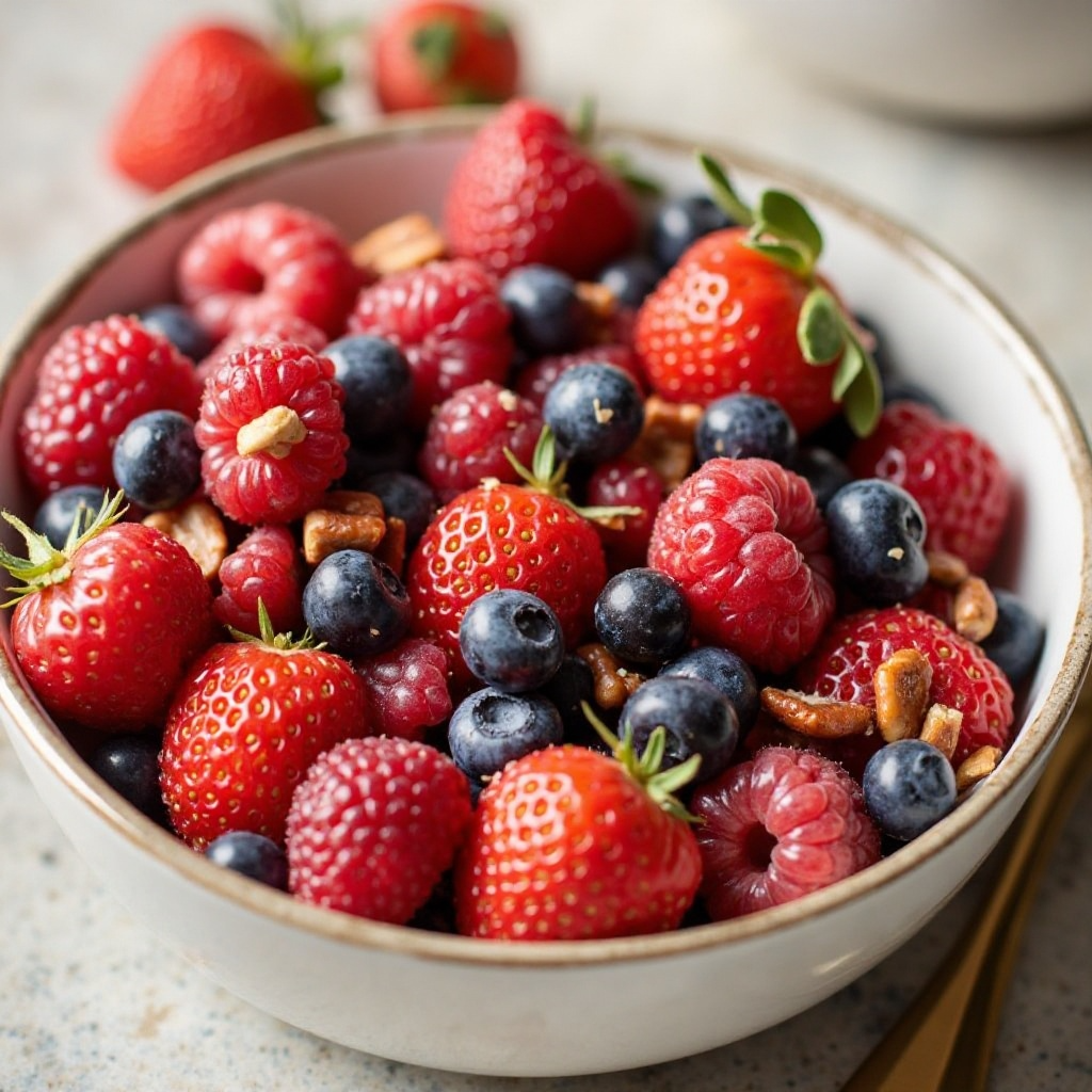 1. En un tazón grande, mezcla las frambuesas, las fresas y los arándanos. Añade las pecanas si lo deseas para una textura crujiente.