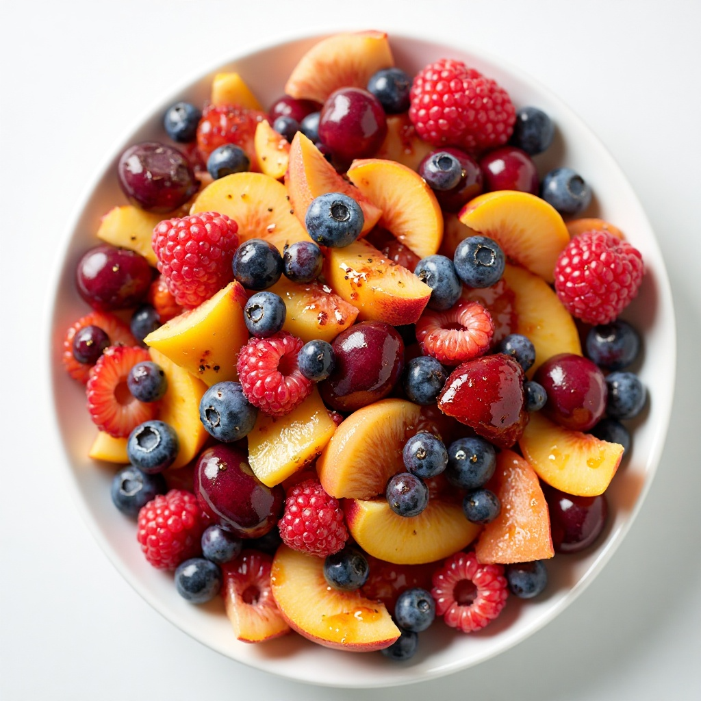 - En un bol grande, mezcla las frambuesas, arándanos, cerezas y melocotones. Asegúrate de que todos los frutos estén bien cubiertos de superficie a superficie.