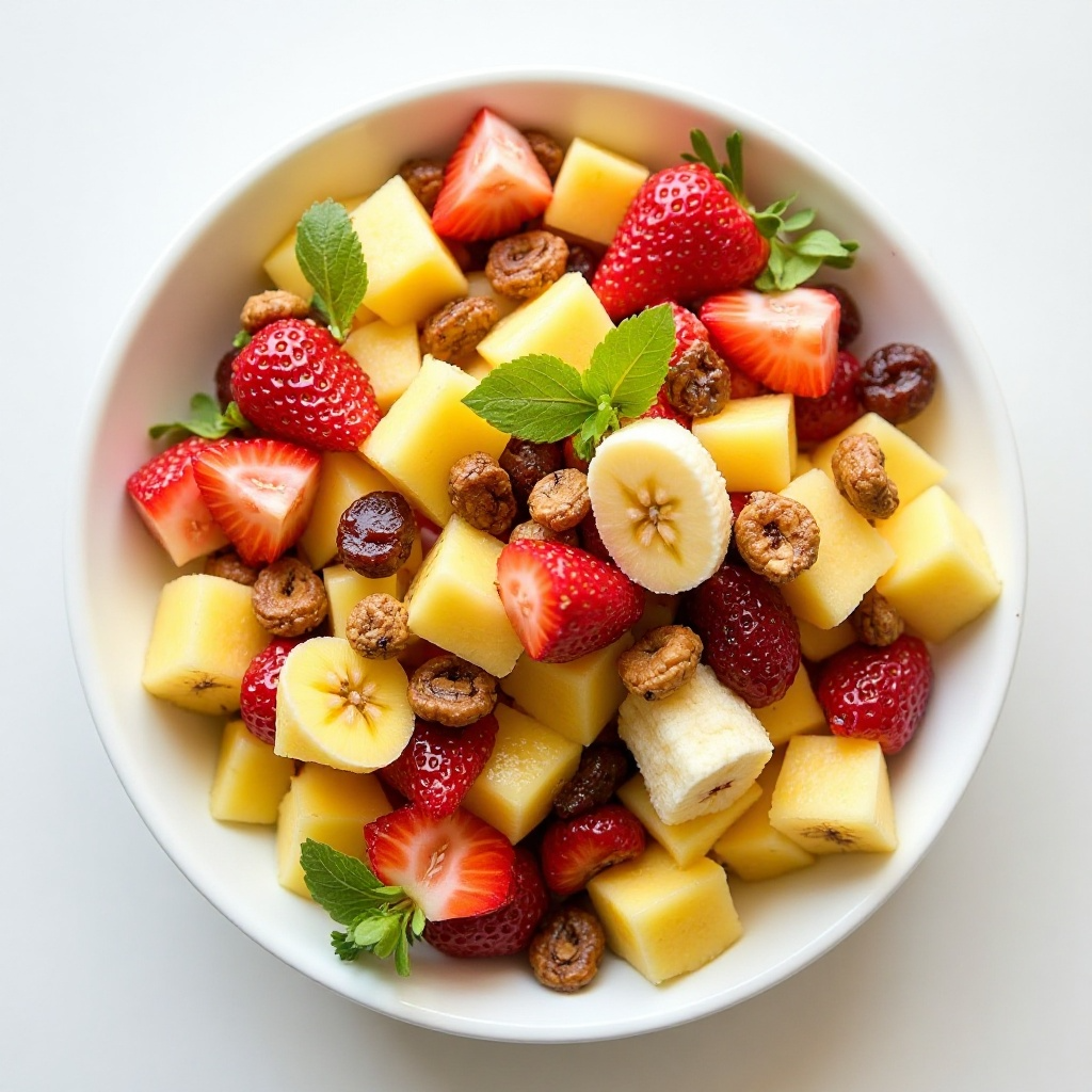 - Lava y corta las frutas en trozos uniformes. En un bol grande, mezcla la manzana, el plátano, la piña y las fresas.
