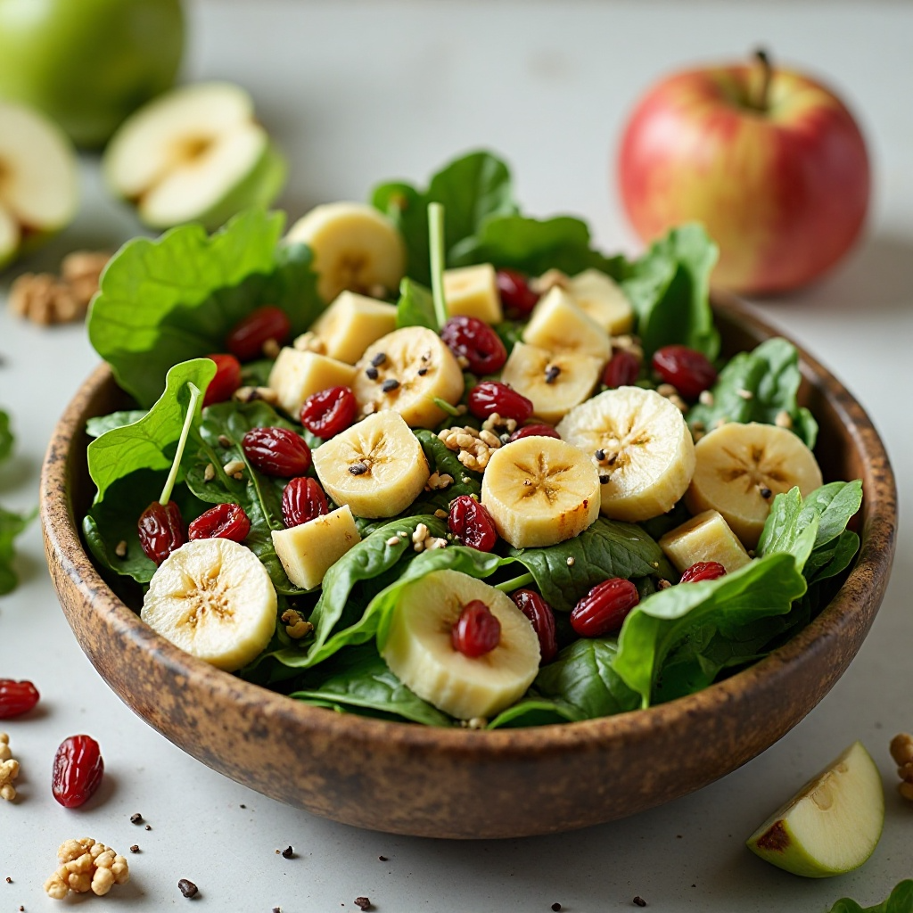 Esta ensalada es baja en calorías y rica en nutrientes gracias a la manzana y el plátano, que aportan fibra y vitaminas esenciales. La opción de usar nueces o semillas de chía puede aumentar la ingesta de grasas saludables y proteínas. Si eliges incluir una reducción de vinagre, asegúrate de moderar su uso ya que el alcohol puede afectar a algunas personas.