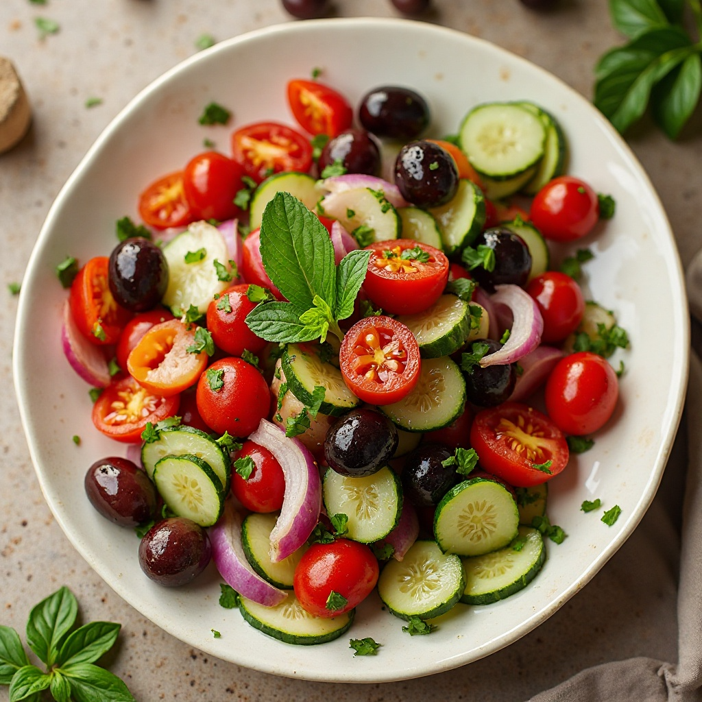 Esta ensalada es baja en calorías y rica en antioxidantes, gracias a las aceitunas, tomates cherry y pepino. El aceite de oliva virgen extra contribuye a la salud cardiovascular, mientras que los componentes frescos como la albahaca proporcionan beneficios adicionales para la piel y el sistema digestivo.