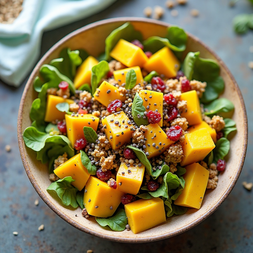 - Añade los cubos de mango a la ensalada y mezcla bien para asegurar que todos los ingredientes se integren con el aderezo.