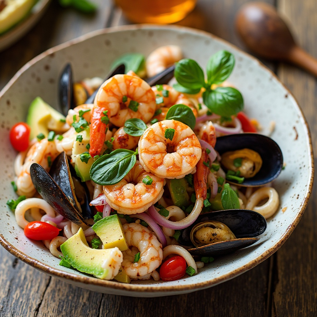 Esta ensalada es rica en proteínas de mar, vitaminas y antioxidantes. El aguacate aporta grasas saludables y fibra, mientras que la albahaca contribuye con antioxidantes. Para una versión más ligera, considera reducir el aceite de oliva o usar un aceite más ligero.