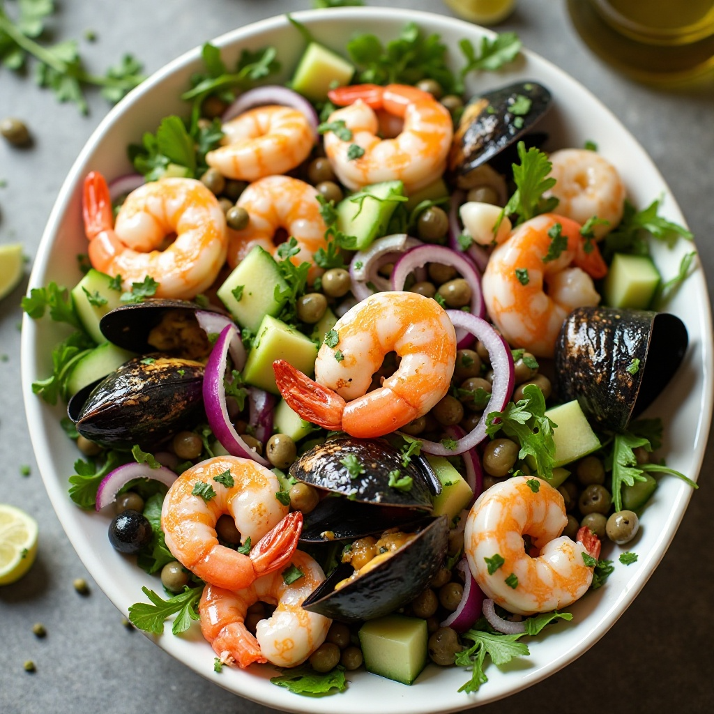 Esta ensalada es un homenaje a la costa de Salobreña, en Andalucía, España. Los mariscos frescos y el aceite de oliva virgen extra, obtenido localmente, le dan a esta preparación un sabor distintivo y saludable. Es perfecta para disfrutar de la abundancia del mar Mediterráneo y del aceite de oliva más apreciado por sus características organolépticas.