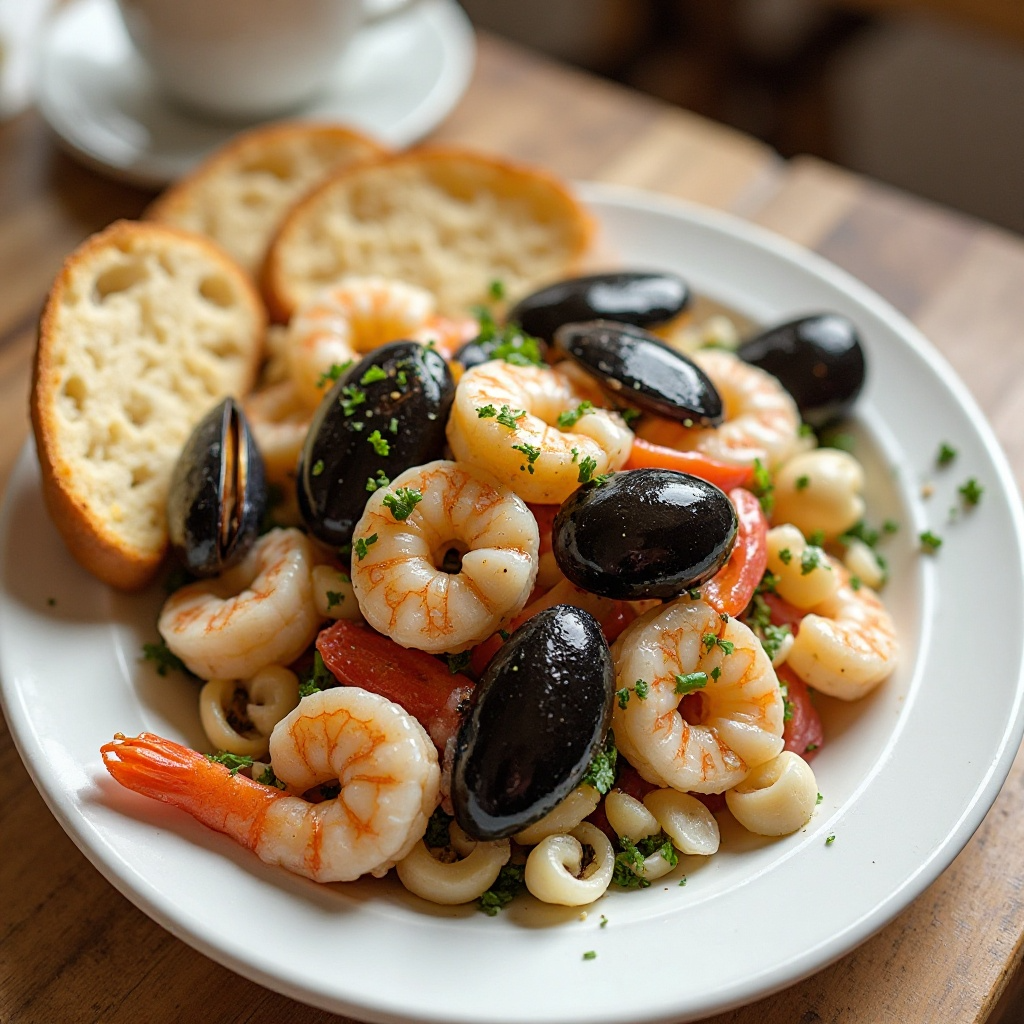 1. Calienta el aceite de oliva en una sartén grande a fuego medio. Añade las gambas y los mejillones, cocínalos hasta que estén rosados, aproximadamente 2 minutos por cada lado. Retira los mejillones con un colador, deja enfriar los mariscos.