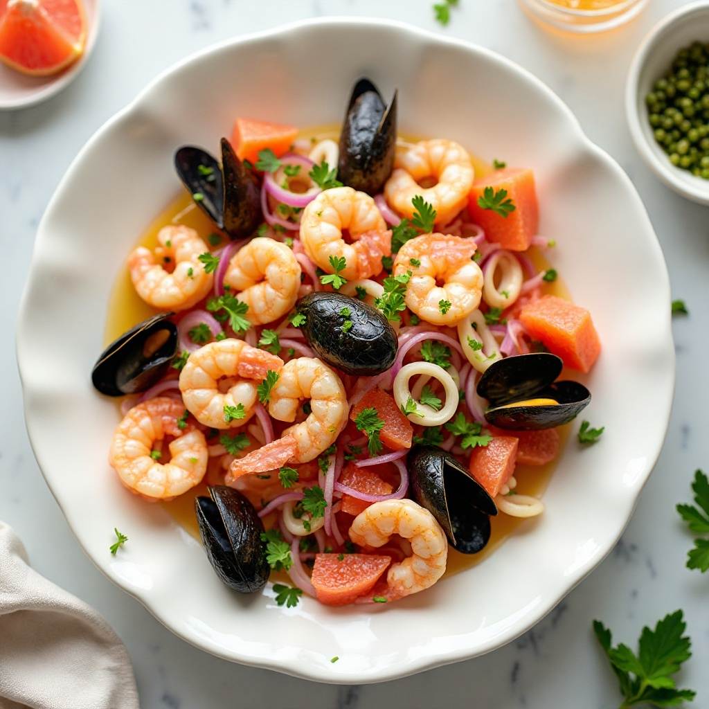 1. En un bol grande, mezcla los camarones, mejillones y calamares. Agrega el jugo de pomelo y revuelve para que todos los mariscos se impregnen de su sabor.