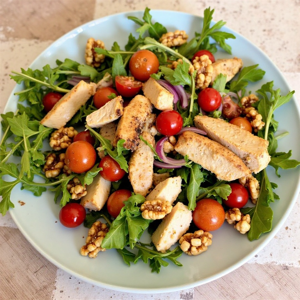 6. Sirve la ensalada en platos, adornando con rúcula fresca si se desea.