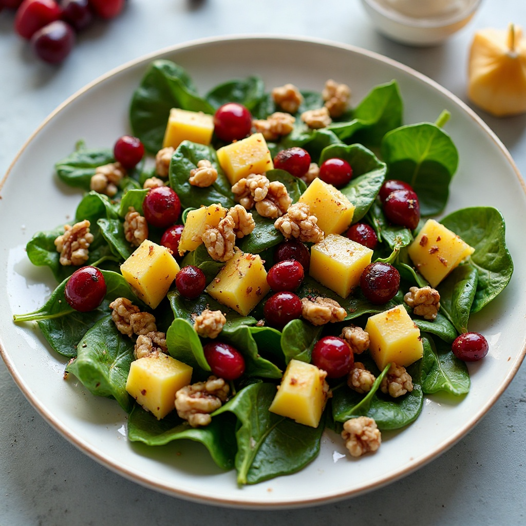 - Añade los arándanos, las nueces y las rodajas de piña a las espinacas marinadas.
