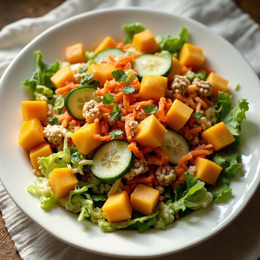 Esta ensalada es una fuente excelente de vitaminas, minerales y fibra gracias a los vegetales frescos utilizados. La lechuga romana es baja en calorías pero rica en nutrientes. El mango aporta vitaminas A y C, y el pepino japonés es hidratante y bajo en calorías. Si evitas las nueces por alergias, la ensalada sigue siendo nutritiva y deliciosa.
