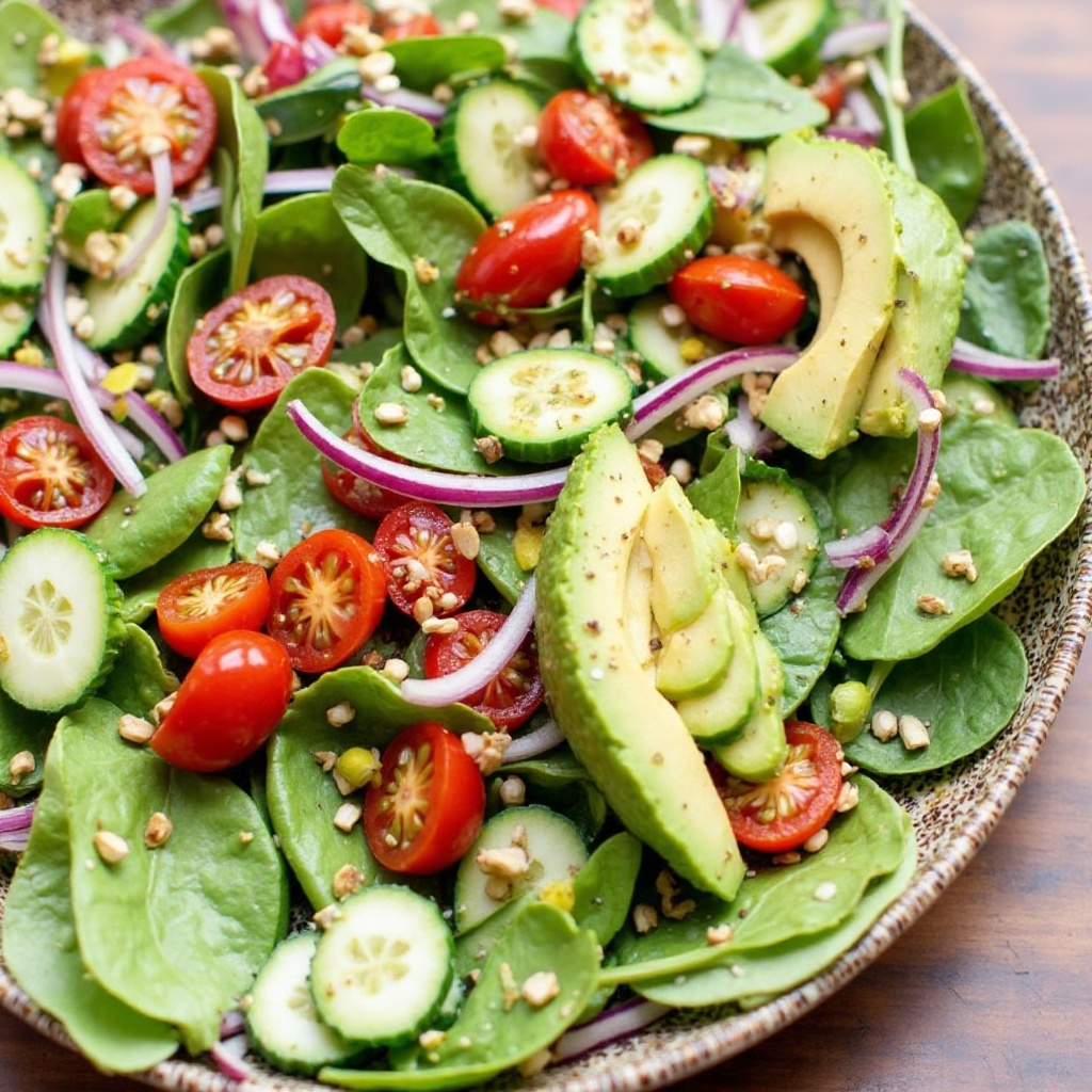 Esta ensalada está repleta de vitaminas, minerales y antioxidantes, gracias a sus ingredientes principales. La espinaca es rica en hierro y ácido fólico, mientras que el aguacate aporta grasas saludables. Los vegetales frescos también ofrecen beneficios digestivos, haciendo de esta ensalada una opción saludable tanto para el cuerpo como para el alma.
