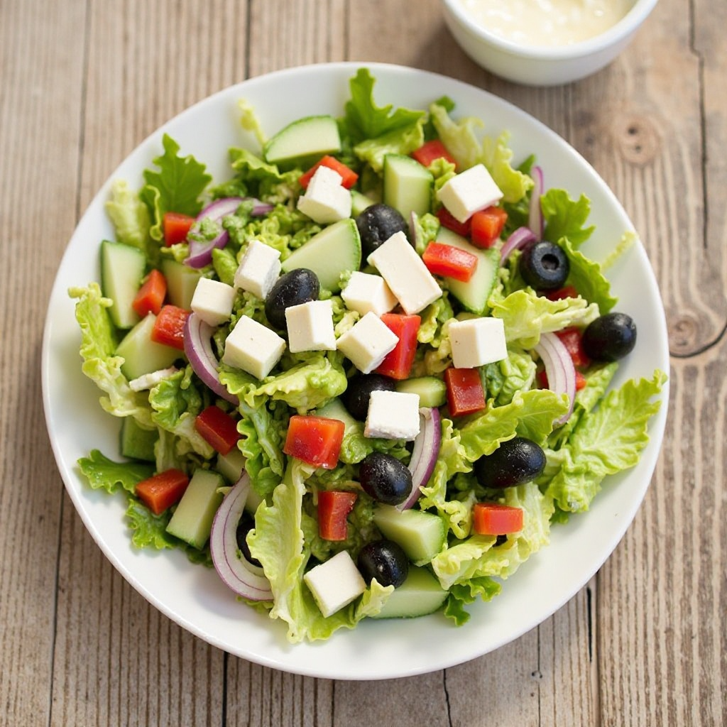 - En un tazón grande, mezcla la lechuga romana, el pimiento rojo, el pepino, la cebolla morada y las aceitunas negras. Añade suficiente vinagre balsámico y aceite de oliva para cubrir los ingredientes, así como una pizca de sal y pimienta.